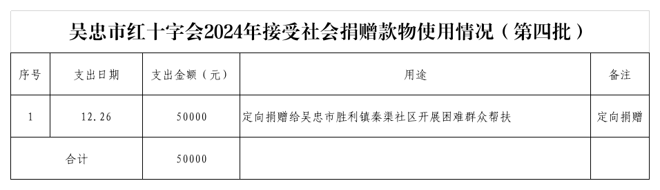 为弘扬“人道、博爱、奉献”的红十字精神,接受捐赠人和社会监督,根据《中华人民共和国公益事业捐赠法》《中国红十字会募捐和接受捐赠管理办法(试行)》等有关规定,现将吴忠市红十字会2024年第四季度接受社会捐赠款物使用情况公示:
